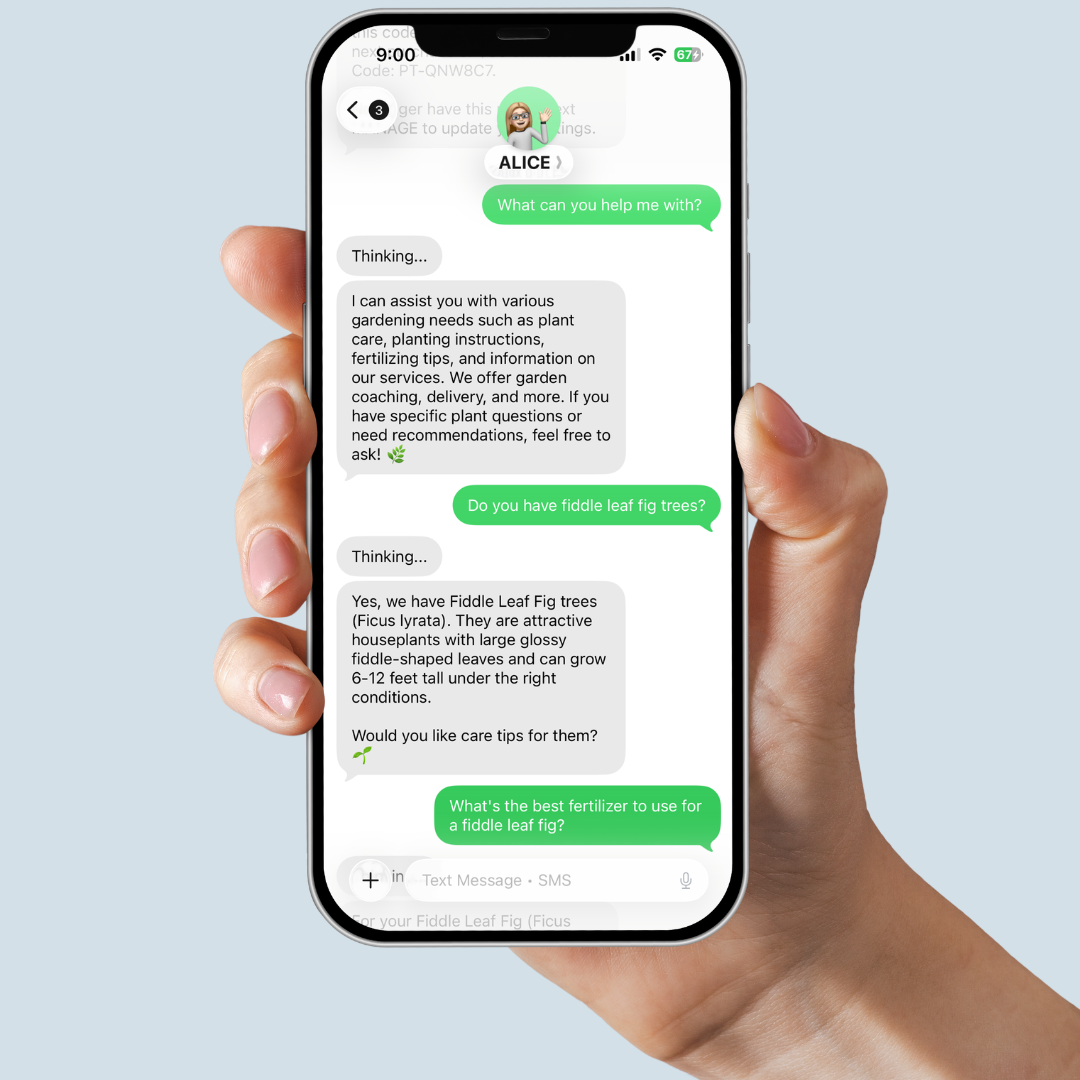 A personal text assistant - loaded with your data - to answer guest and staff questions on plant availability, plant choice, plant care, store specials and more.