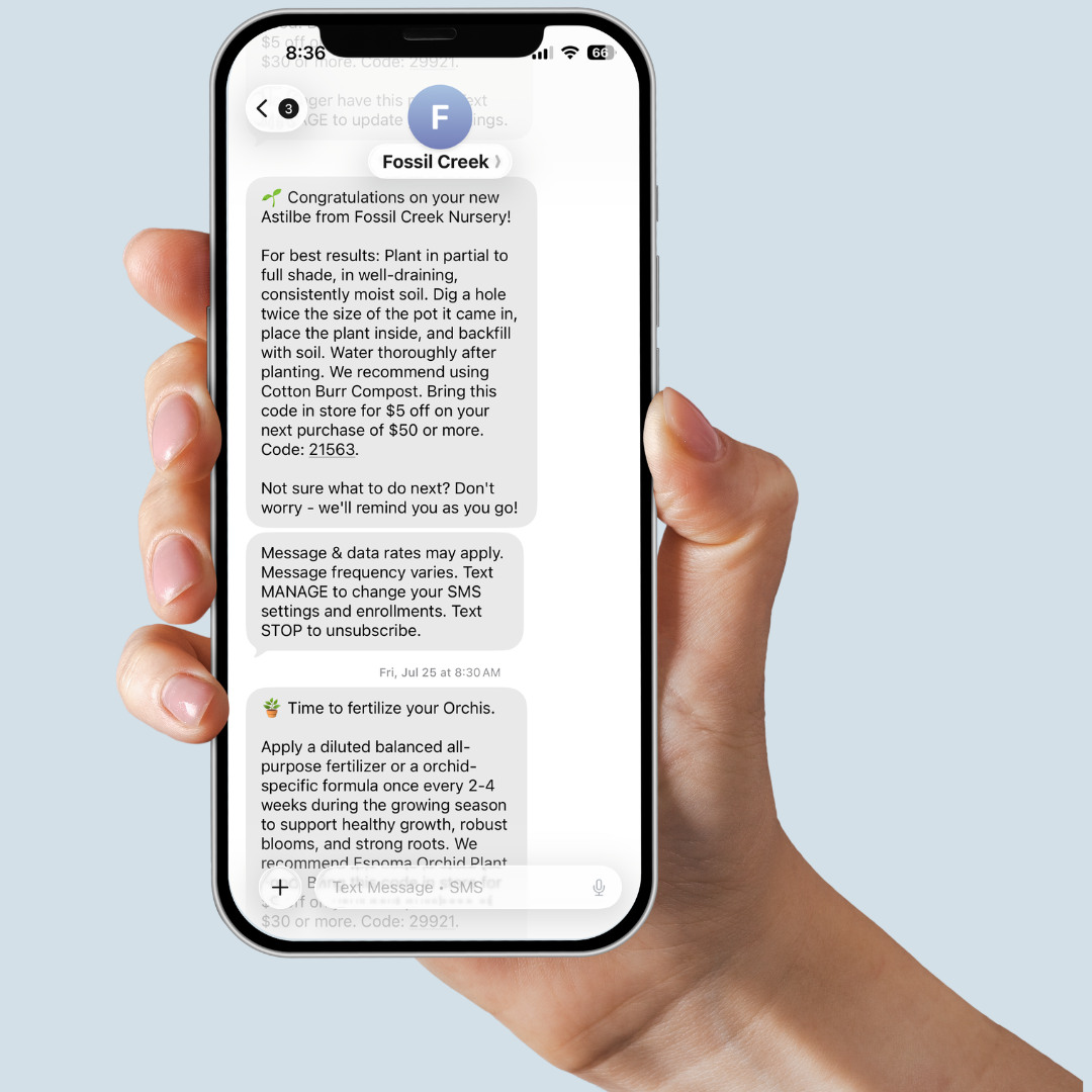 Drive loyalty and repeat purchase with automated SMS texts that tell customers when and how to plant, water, fertilize and winterize. Tied to product recommendations & a coupon to drive incremental purchase.